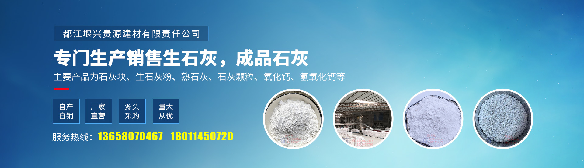 都江堰興貴源建材有限責任公司是一家以專門生產銷售生石灰,成品石灰的公司,擁有豐富的石灰石資源。工廠面積十余畝,在都江堰、峨眉均有產品供應基地。 主要產品為石灰塊、生石灰粉、熟...